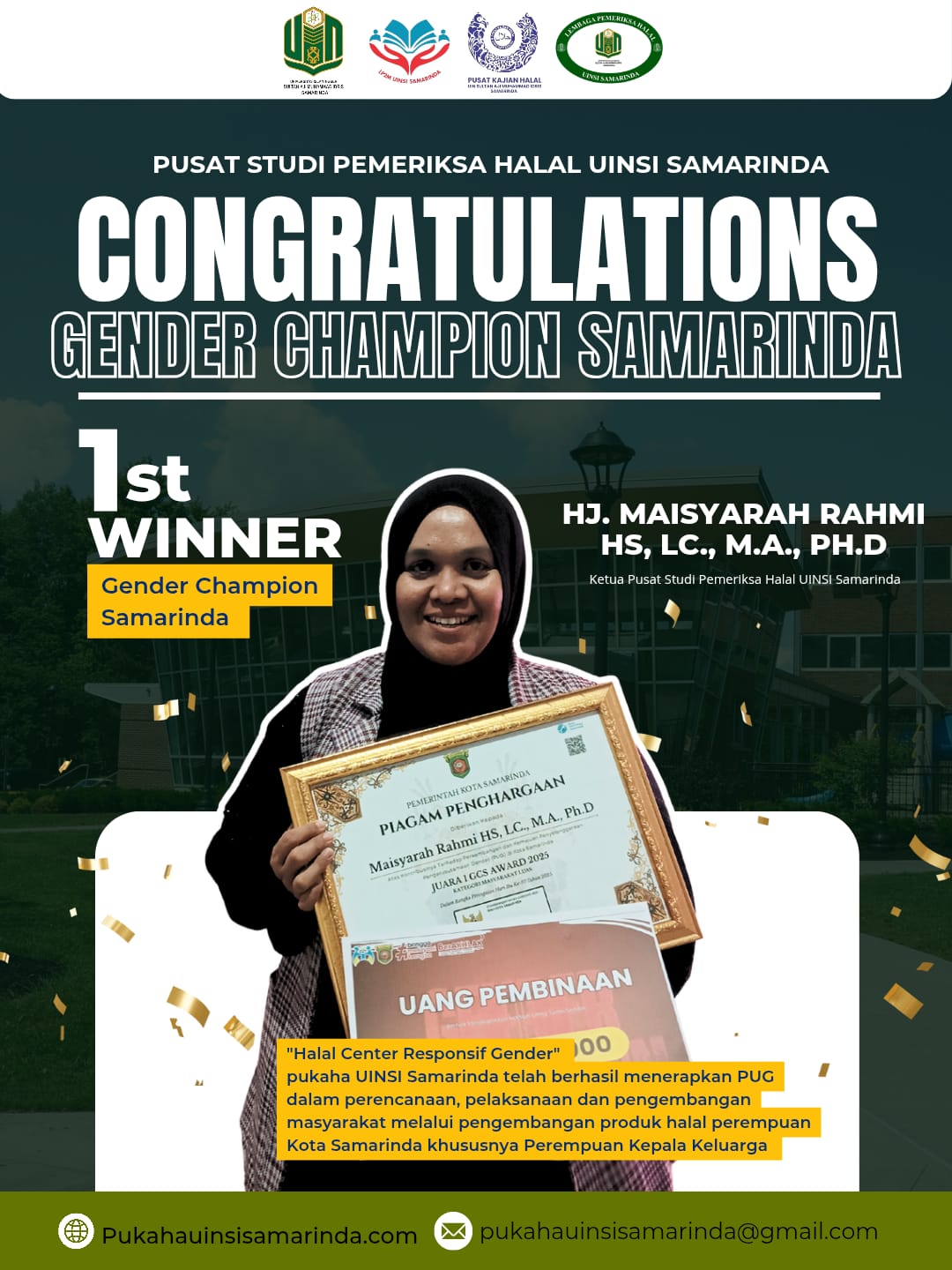 Membanggakan, Ketua Pusat Studi Pemeriksa Halal Hj. Maisyarah Rahmi Hasan, Lc., MA., Ph.D Dinobatkan Sebagai Juara 1 Gender Champion Samarinda 2025Membanggakan, Ketua Pusat Studi Pemeriksa Halal Hj. Maisyarah Rahmi Hasan, Lc., MA., Ph.D Dinobatkan Sebagai Juara 1 Gender Champion Samarinda 2025
