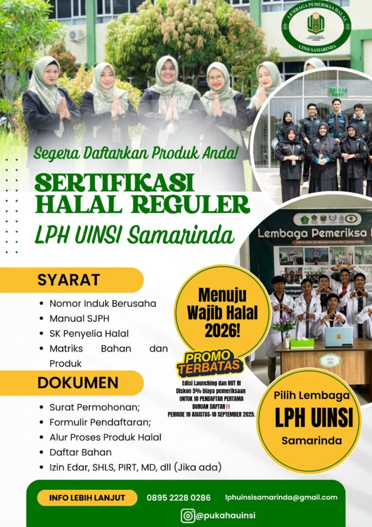Lembaga Pemeriksa Halal (LPH) UINSI Samarinda memberikan kabar gembira kepada pelaku UMKM Kalimantan Timur yang ingin mengajukan sertifikasi Halal reguler akan mendapatkan diskon 5% biaya pemeriksaan produk halal khusus pada periode 10 Agustus sampai 10 September 2025 dalam rangka Launching dan Promosi LPH baru dan juga pembukaan layanan umum laboratorium produk halal UINSI Samarinda.