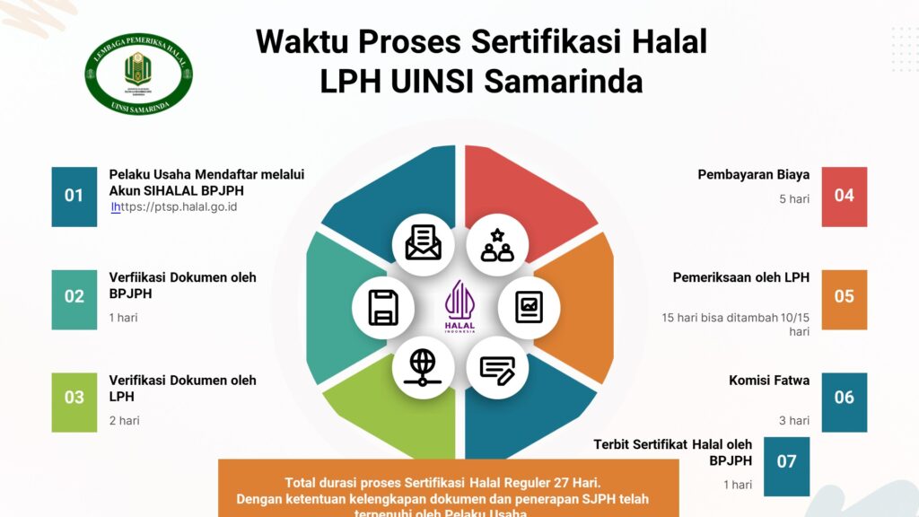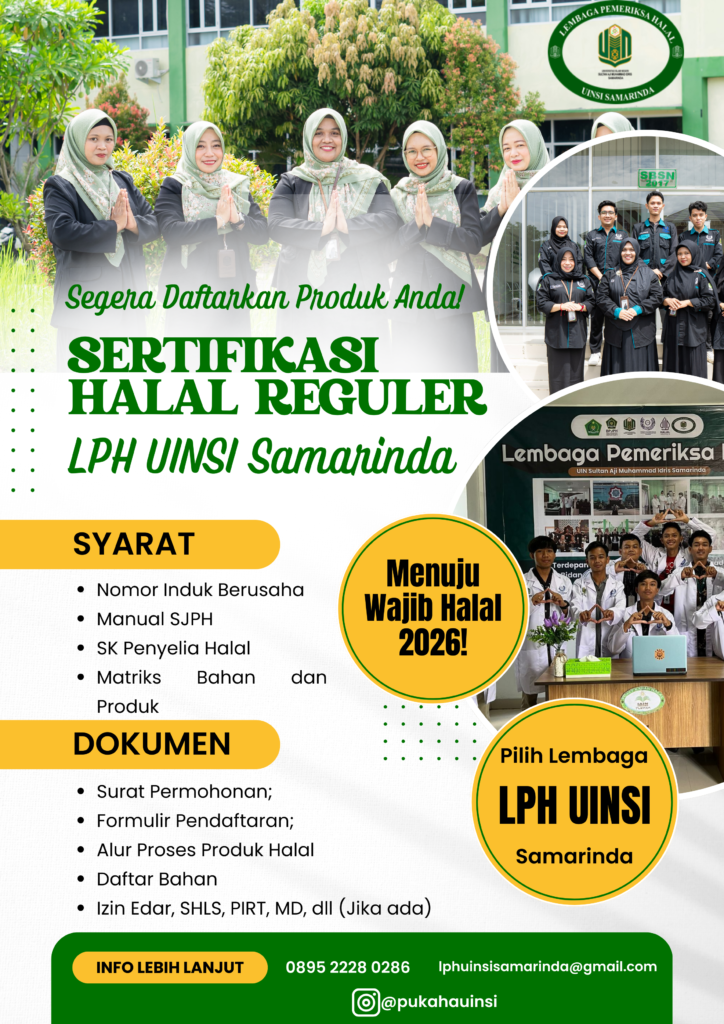 - Fasilitas Digital & Sistem Informasi: Terhubung dengan sistem SIHALAL BPJPH untuk mempercepat proses administrasi sertifikasi halal dan E-Halal UINSI Samarinda untuk mengakomodir dokumen pengajuan sertifikasi halal melalui LPH UINSI Samarinda.