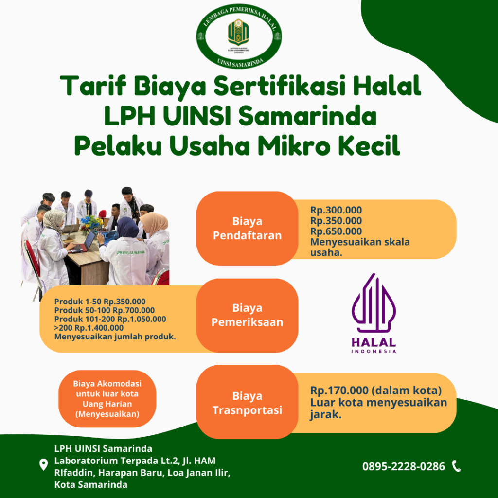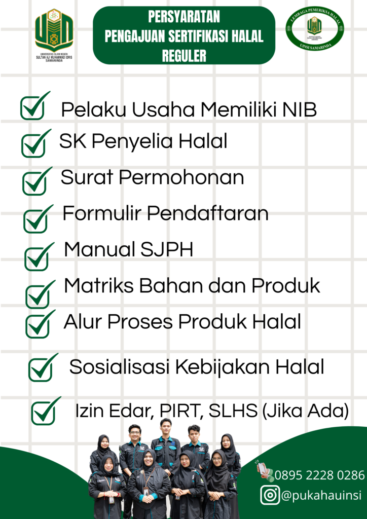 - Laboratorium Terakreditasi kerjasama dengan Lembaga Eksternal UINSI Samarinda: Mendukung pemeriksaan bahan tambahan, kontaminasi silang, dan keamanan produk.