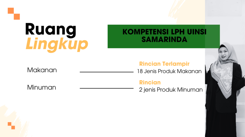 Sebagai Lembaga Pemeriksa Halal (LPH) yang berperan dalam pemeriksaan produk halal, LPH UINSI Samarinda memiliki ruang lingkup kompetensi yang mencakup produk pangan dan minuman, dengan rincian sebagai berikut: