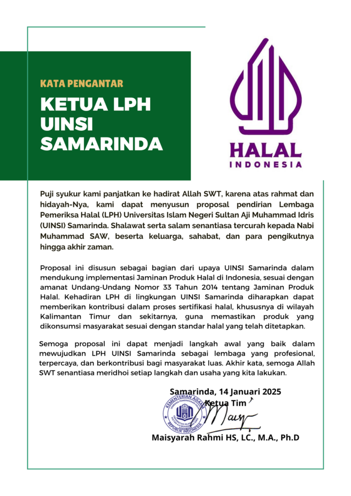 Kehadiran Lembaga Pemeriksa Halal (LPH) di lingkungan UIN Sultan Aji Muhammad Idris (UINSI) Samarinda merupakan bagian dari implementasi Undang-Undang Nomor 33 Tahun 2014 tentang Jaminan Produk Halal (JPH), yang menegaskan bahwa setiap produk yang beredar di Indonesia harus memiliki sertifikat halal. Untuk memastikan kepastian hukum tersebut, Badan Penyelenggara Jaminan Produk Halal (BPJPH) Kementerian Agama RI berwenang menunjuk Lembaga Pemeriksa Halal sebagai mitra pemeriksa proses produk halal sebelum diterbitkan sertifikat halal oleh BPJPH.