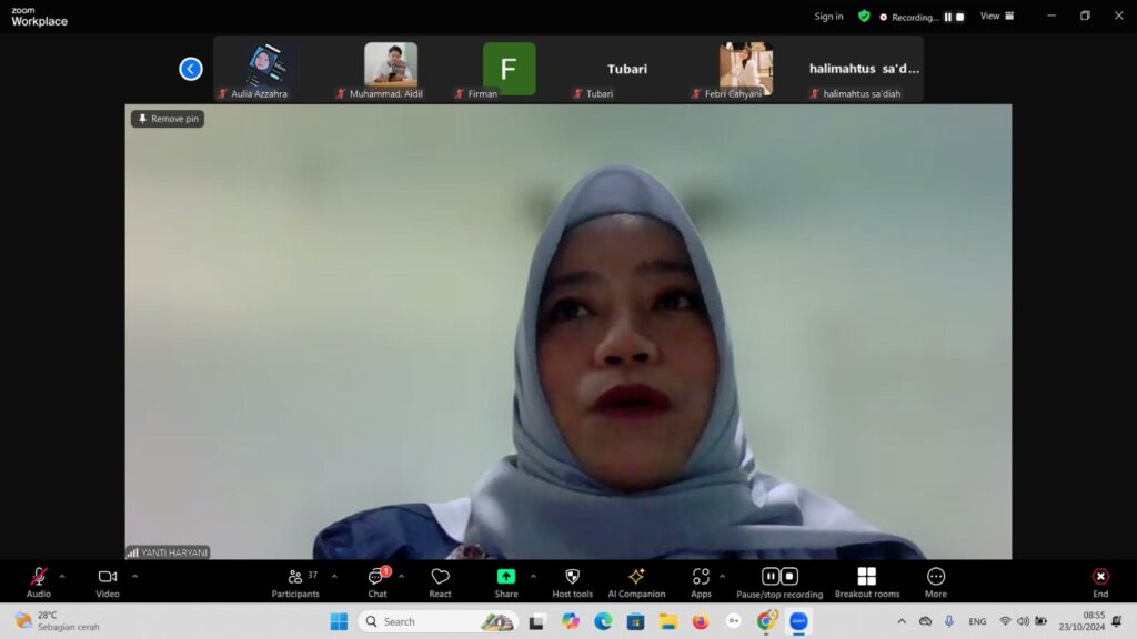 Materi pertama disampaikan oleh Ibu Yanti Haryani, S.H.I., M.H, dengan materi regulasi dan kebijakan Jaminan produk halal. Sebagaimana diketahui, kewajiban sertifikasi halal merupakan amanah undang-undang jaminan produk halal nomor 33 tahun 2024 yang menyebutkan bahwa seluruh produk yang beredar dan dipasarkan di Indonesia wajib memiliki sertifikat halal. “Sertifikasi halal kini bukan hanya dilakukan secara suka rela, namun penerapan tahap I kewajiban halal sudah mulai berlaku sejak Oktober 2024 untuk produk pangan, dan jasa penyembelihan pada skala usaha menengah dan besar, oleh karena itu, kita perlu memberikan informasi secara masiv dan mensosialisasikan kewajiban halal tersebut kepada UMKM yang ada di seluruh Indonesia.” jelas Yanti.