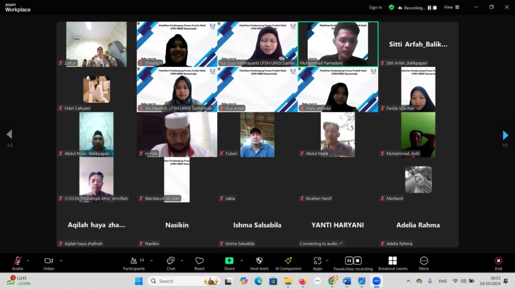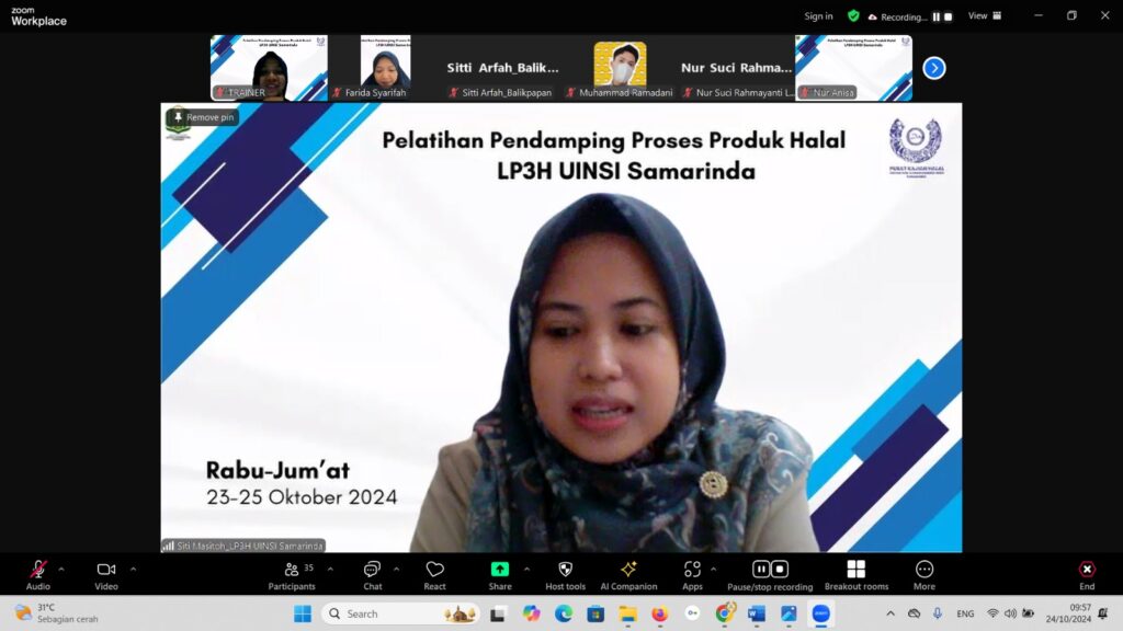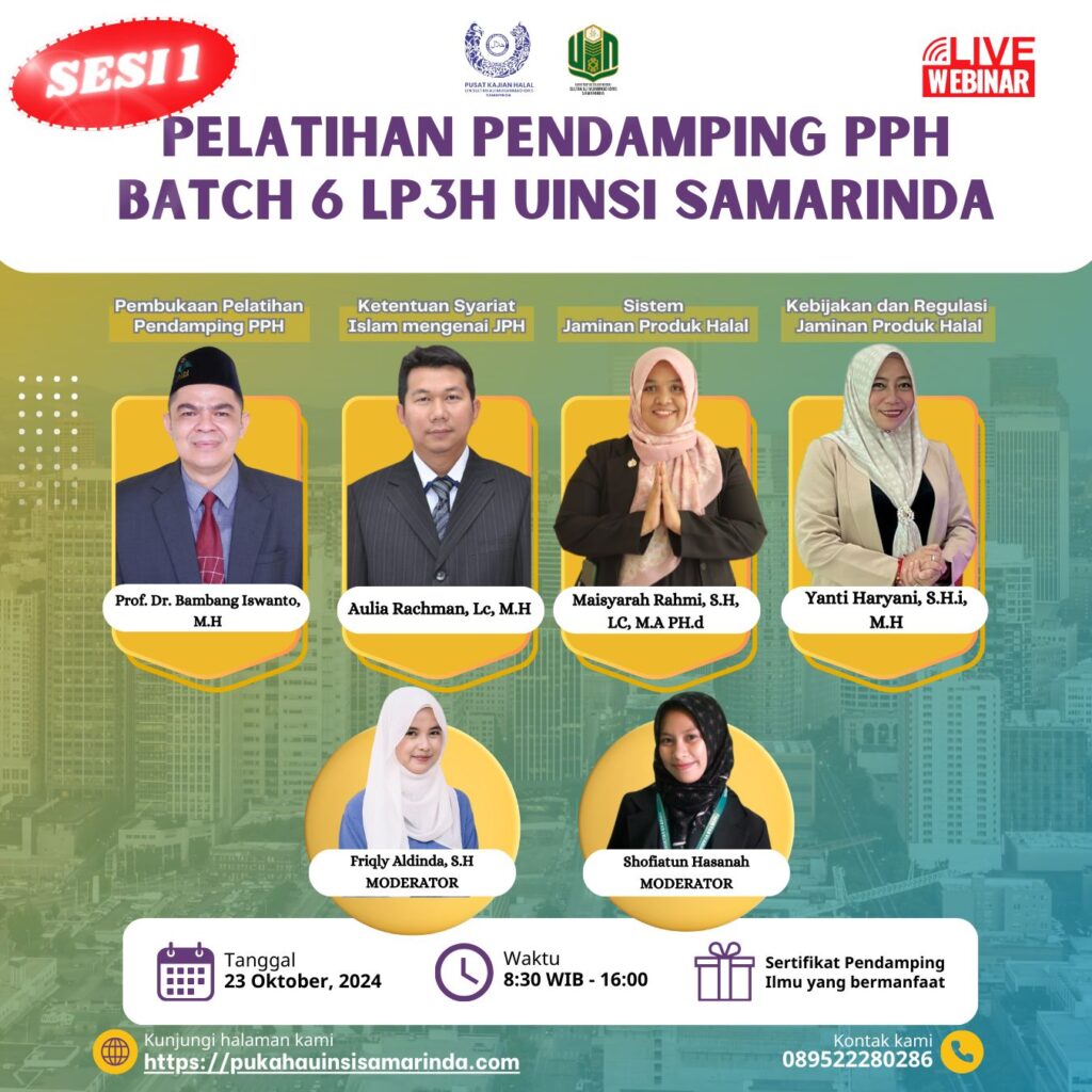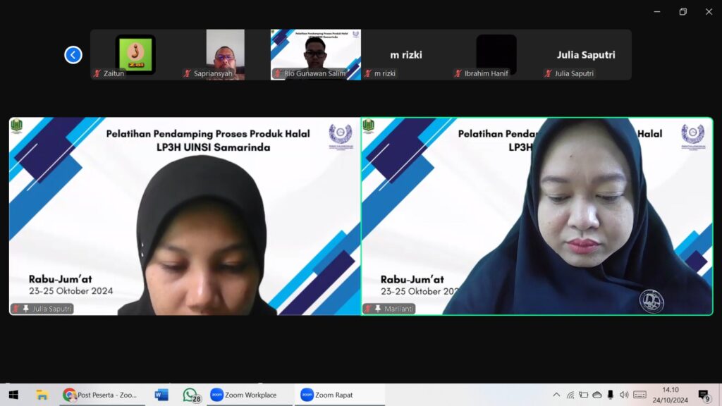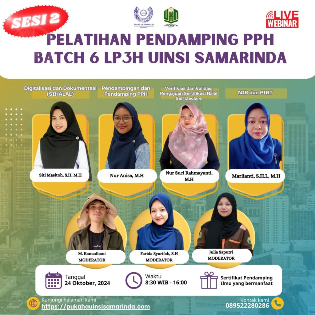 Pusat Kajian Halal UINSI Samarinda kembali menggelar pelatihan Pendamping Proses produk Halal (P3H) yang dilaksanakan secara daring melalui Zoom meeting, dengan peserta yang berasal dari masyarakat umum, penyuluh Agama Islam, dan juga mahasiswa. Kegiatan ini merupakan kegiatan rutin yang dilaksanakan Pukaha UINSI Samarinda guna menambah tim pendamping PPH untuk mendampingi Pelaku Usaha Mikro Kecil mendapatkan sertifikasi halal dengan jalur self Declare (pernyataan Pelaku Usaha).