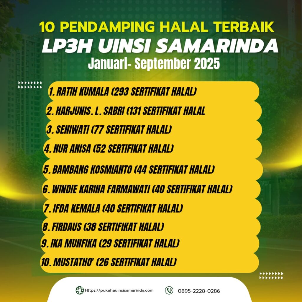 Berikut adalah nama-nama yang terpilih menjadi pendamping dengan pendampingan terbanyak periode Januari hingga September 2025. Program ini akan terus dilanjutkan untuk memantau keatifan seluruh pendamping LP3H UINSI Samarinda.