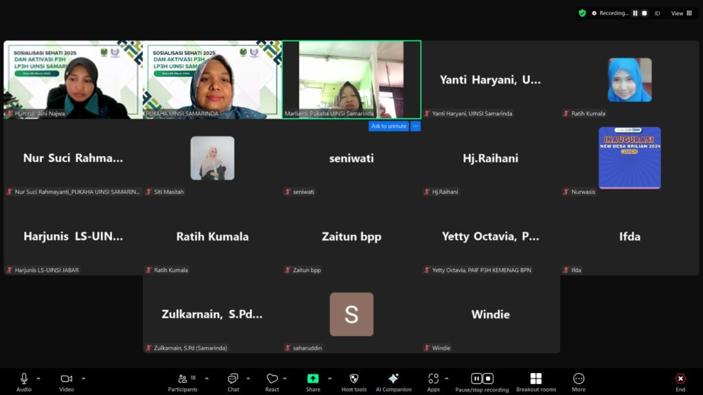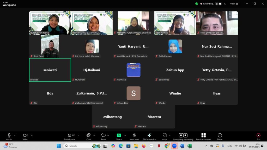LP3H UINSI Samarinda menggelar rapat Sosialisasi SEHATI tahun 2025 dan Aktivasi P3H yang berlangsung pada hari Rabu 05 Maret 2025. Rapat ini dihadiri oleh seluruh P3H se indonesia yang berada dibawah naungan LP3H UINSI Samarinda. Sosialisasi ini dilaksanakan melalui zoom meeting dan di buka langsung oleh ibu Maisyarah Rahmi Hasan, Lc., M.A., Ph.D selaku ketua LP3H UINSI Samarinda.